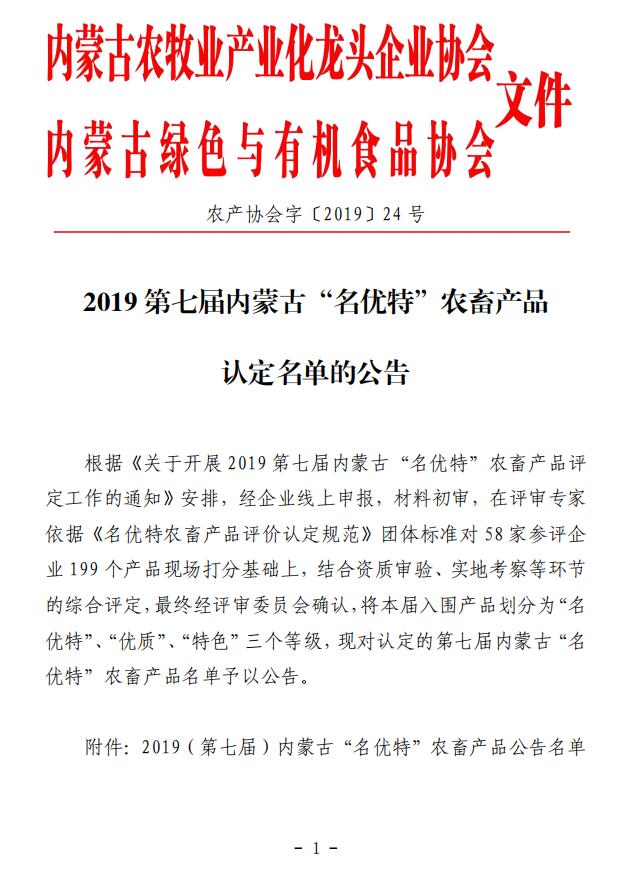 標(biāo)題:2019第七屆內(nèi)蒙古“名優(yōu)特”農(nóng)畜產(chǎn)品 認(rèn)定名單的公告