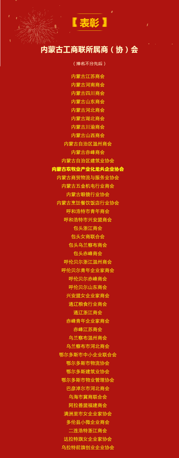 標(biāo)題:喜報(bào)!內(nèi)蒙古農(nóng)牧業(yè)產(chǎn)業(yè)化龍頭企業(yè)協(xié)會(huì)再次榮獲全國“四好”商會(huì)榮譽(yù)稱號(hào)