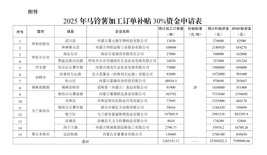 按照《內蒙古自治區(qū)農(nóng)牧廳關于印發(fā)2025年馬鈴薯加工訂單補貼項目實施方案的通知》(內農(nóng)牧加工發(fā)〔2025〕305號)要求,經(jīng)盟市組織申報、實地核查、公示,自治區(qū)復核,現(xiàn)將2025年相關盟市上報的馬鈴薯加工訂單補貼30%資金申請情況予以公示,公示期為15天。如對公示有異議,請及時向自治區(qū)農(nóng)牧廳反映。
