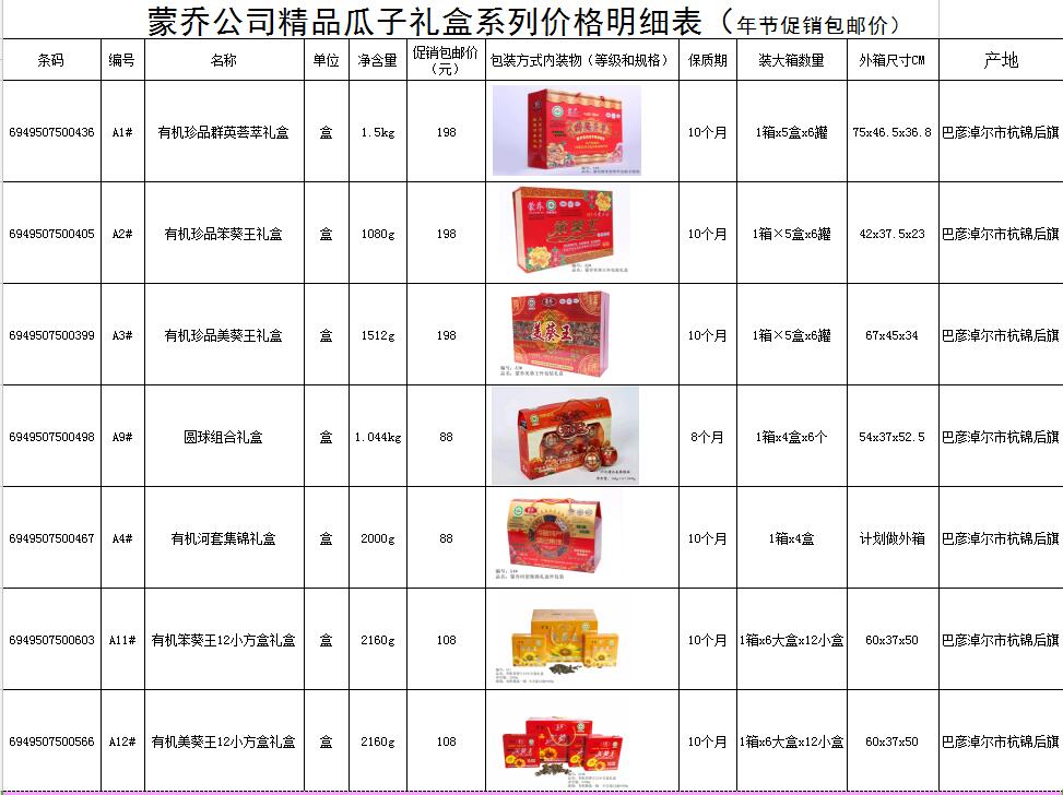呼市鄂爾多斯大街石羊橋十字路西移動大廳西20米北巷,現(xiàn)有大量年節(jié)禮品盒:巴盟有機(jī)葵花子禮盒低價促銷包郵,聯(lián)系電話:15334782928,十盒包郵,價格如下: