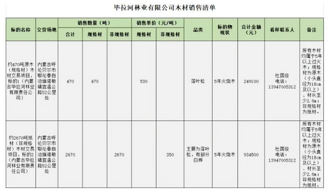 標(biāo)的木材為火燒跡地清理材,分為兩個(gè)標(biāo)的,其中標(biāo)的1是約 470 噸的原木(規(guī)格材),標(biāo)的2是約2670噸的紙材(非規(guī)格材)(所有出材以實(shí)際出材量為準(zhǔn)),項(xiàng)目明細(xì)如下: