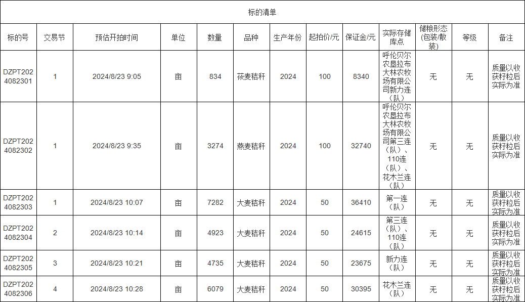 轉讓標的為莜麥秸稈、燕麥秸稈、大麥秸稈,涉及面積莜麥秸稈834畝、燕麥秸稈3274畝、大麥秸稈(1-4標)分別為7282畝、4923畝、4735畝、6079畝,意向受讓方在競買前應自行對標的預估數(shù)量和質量情況進行充分了解,交易標的均以實際狀況為準。標的存放地位于呼倫貝爾農墾拉布大林農牧場有限公司,詳情見標的清單:
