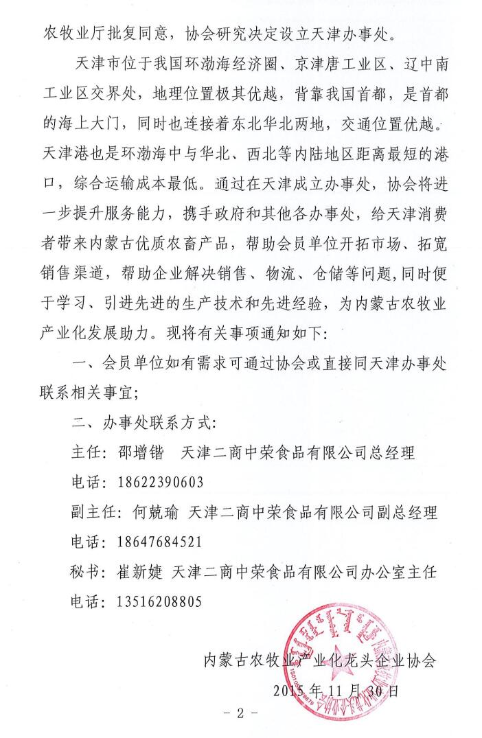 關于成立內蒙古農牧業(yè)產業(yè)化龍頭企業(yè)協(xié)會天津辦事處的通知