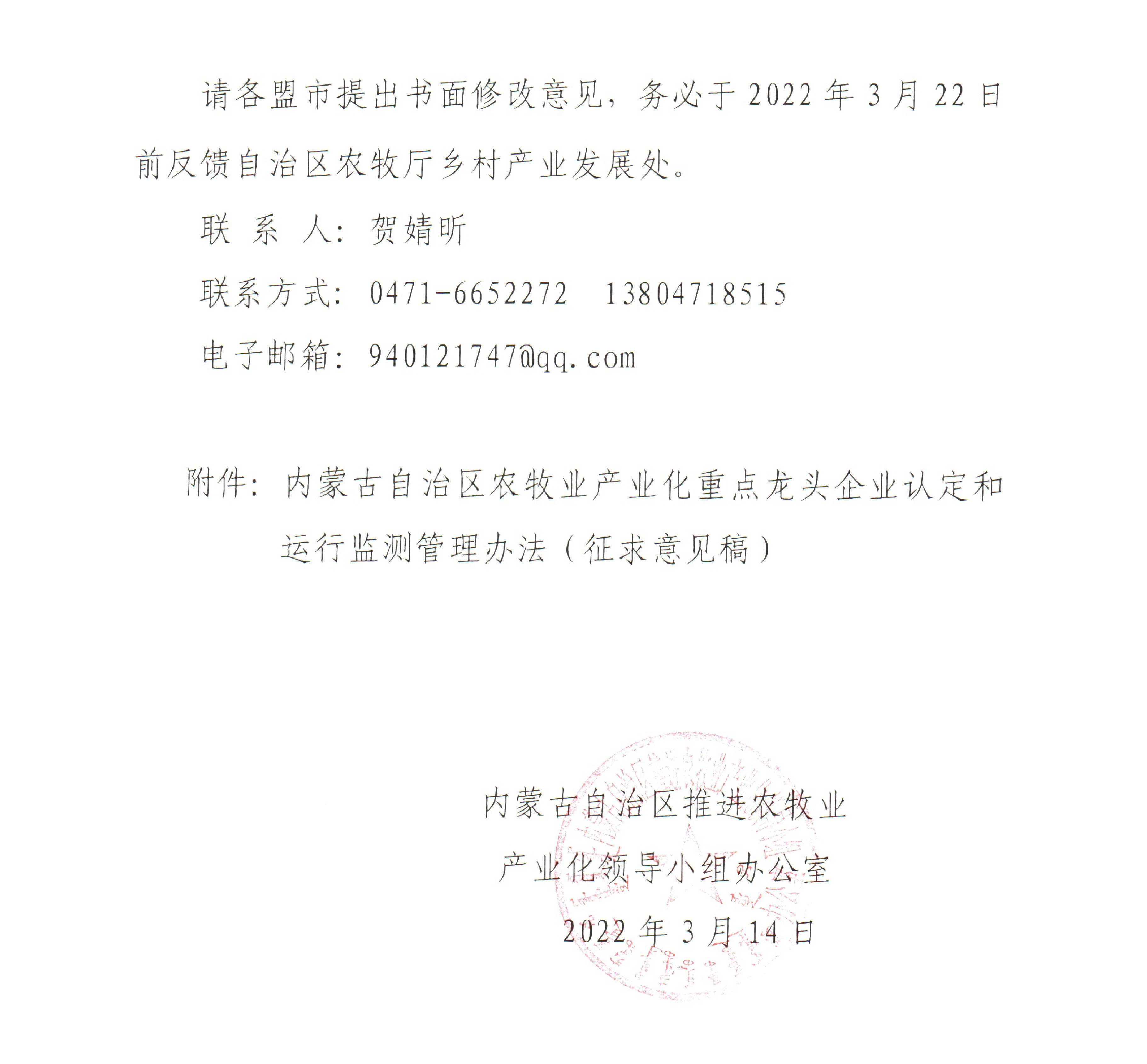 附件:關(guān)于征求修訂《內(nèi)蒙古自治區(qū)農(nóng)牧業(yè)產(chǎn)業(yè)化重點(diǎn)龍頭企業(yè)認(rèn)定和運(yùn)行監(jiān)測(cè)管理辦法(征求意見(jiàn)稿)》修改意見(jiàn)的函