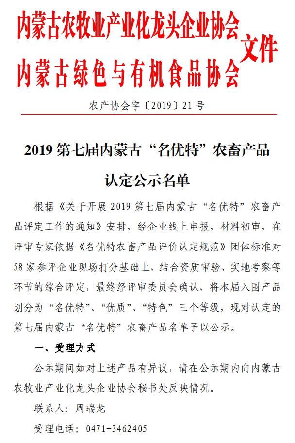 2019第七屆內(nèi)蒙古“名優(yōu)特”農(nóng)畜產(chǎn)品認定公示名單