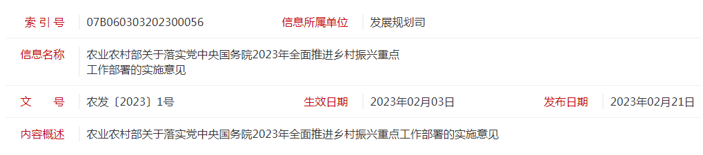 標題:農(nóng)發(fā)〔2023〕1號農(nóng)業(yè)農(nóng)村部關于落實黨中央國務院2023年全面推進鄉(xiāng)村振興重點工作部署的實施意見