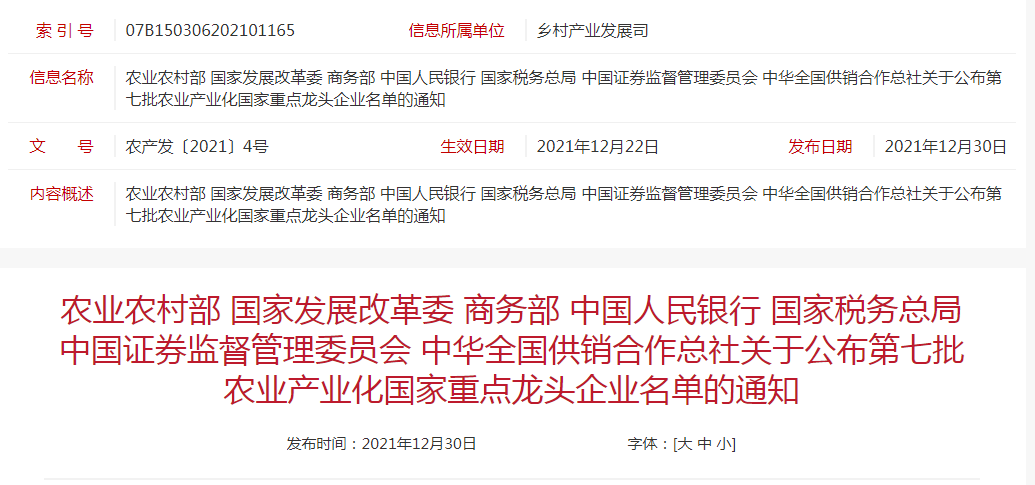 企業(yè)名稱:農(nóng)業(yè)農(nóng)村部 國家發(fā)展改革委 商務部 中國人民銀行 國家稅務總局 中國證券監(jiān)督管理委員會 中華全國供銷合作總社關(guān)于公布第七批農(nóng)業(yè)產(chǎn)業(yè)化國家重點龍頭企業(yè)名單的通知