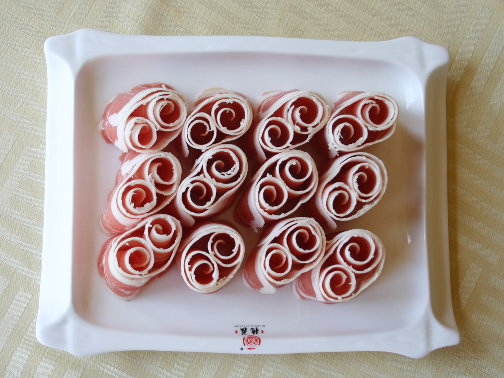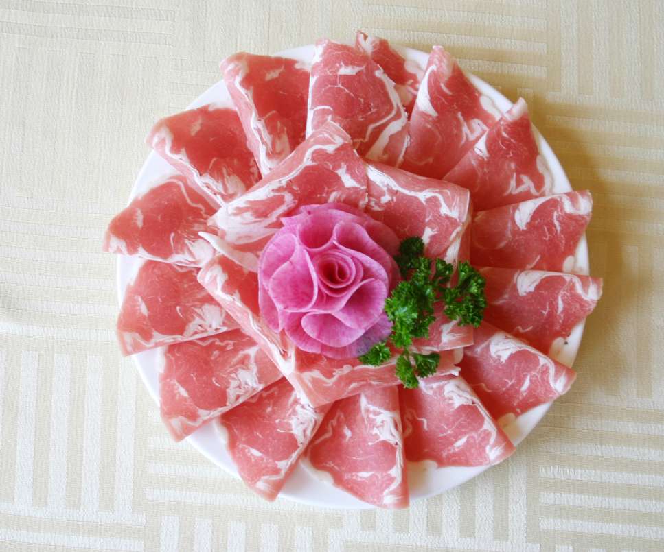七、   杜泊羊肉卷:選用原料:采用南非引進(jìn)的杜伯羊,經(jīng)過雜交改良的品種。肉中脂肪分布均勻,胴體品質(zhì)高。經(jīng)選修之后,全部按照肥瘦搭配制成羊肉卷。一涮即熟、就涮不老。