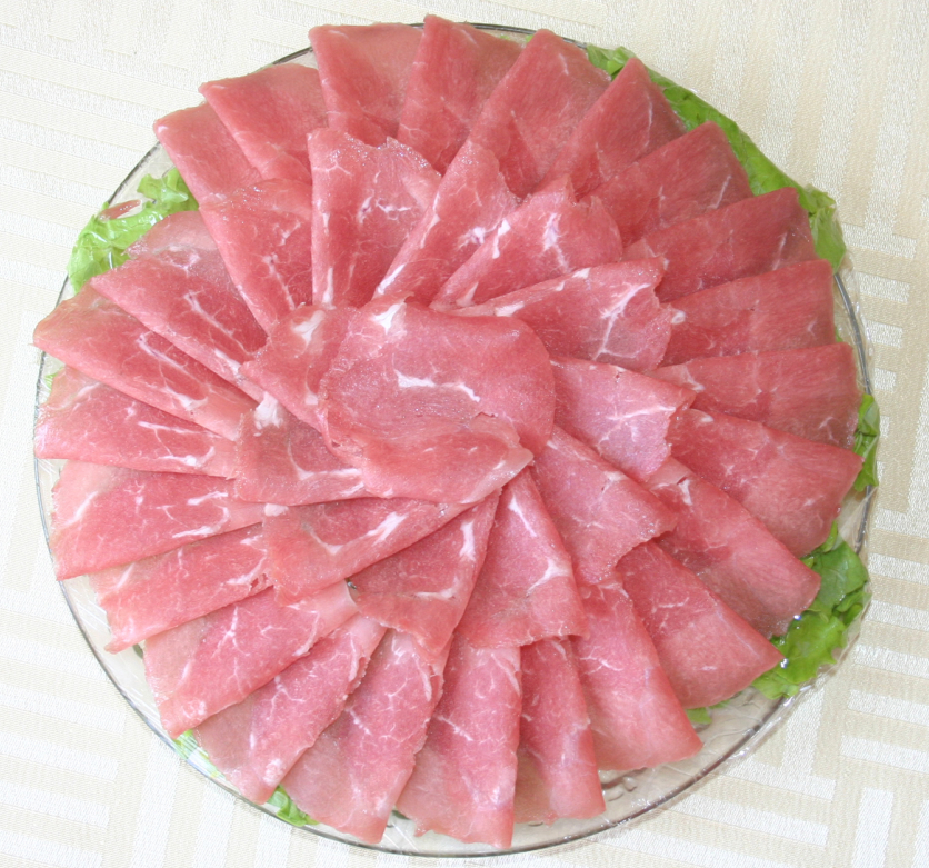 一、   羊肉坯:選用原料:精選上腦、前腿、后腿,按肉紋方向一致、肥瘦搭配均勻,碼制而成。其特點(diǎn)紅白相間、外表美觀、上盤的產(chǎn)品美觀。