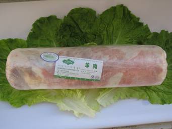 剔骨羔羊胴體羊肉(必須有后腿肉)常規(guī)修肉、去三角線硬皮部分、去掉全部背筋,順紋擺放,瘦肉朝外卷,肥瘦搭配均勻,部分碎肉(小于10%),肉塊順向碼放。