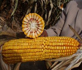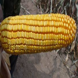 春播區(qū)從出苗至成熟126天。株型半緊湊,莖桿“之”字型程度弱,葉片上沖直立,葉色深綠,莖桿粗壯,氣生根發(fā)達(dá),高抗倒伏。株高265-270cm,穗位85cm。果穗長(zhǎng)筒型,穗長(zhǎng)24 cm,穗粗4.2 cm,左右,穗行數(shù)14-16行,紅軸,籽粒橙黃色,馬齒型。高抗黑粉病,抗絲黑穗病、大斑病、莖腐病,抗玉米螟及紅蜘蛛。在高產(chǎn)攻關(guān)試驗(yàn)中,產(chǎn)量可達(dá)1000 kg/667m2