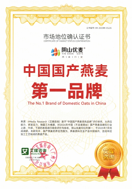 2025年7月,內(nèi)蒙古陰山優(yōu)麥?zhǔn)称酚邢薰精@得權(quán)威咨詢機(jī)構(gòu)艾媒咨詢(iiMedia Research)頒發(fā)的“全球裸燕麥第一品牌”與“中國國產(chǎn)燕麥第一品牌”市場地位確認(rèn)證書。同時,其創(chuàng)新產(chǎn)品“低GI五黑燕麥片”亦被權(quán)威認(rèn)證為全球開創(chuàng)者,標(biāo)志著陰山優(yōu)麥在全球燕麥行業(yè)取得突破性成果。